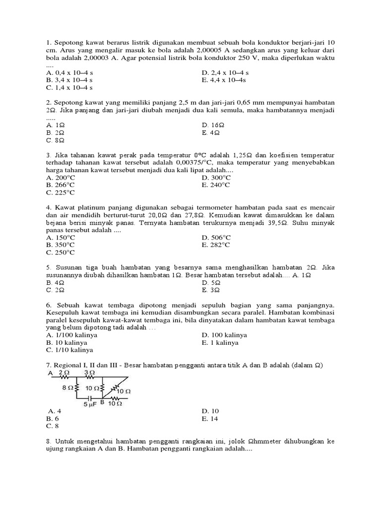 Jika tahanan kawat perak pada temperatur 0℃ adalah 1,25 ohm dan koefisien temperatur terhadaptahanan kawat tersebut adalah 0,00375/℃ , temperatur yang menyebabkan harga tahanan kawat tersebut menjadi. Tes evaluasi bab i kelas: Grafik di bawah menunjukkan kuat arus yang mengalir dalam suatu hambatan r, sebagai fungsi waktu. Untuk rangkaian di bawah ini jika s1 dan s2 ditutup, maka voltmeter ( v ) akan menunjukkan harga. Sedangkan kawat platina panjang 0,48 m.